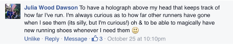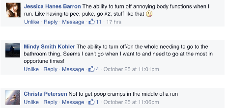 In a dream world, what capabilities do you wish runners had? Maybe it’s a GPS chip embedded into your brain that tells you the location of the nearest porta-potties on your run. Perhaps it’s an ability to grow a new hair tie out of your wrist when you’re in need. We asked you to tell us your ideas — find out if your response made the list!