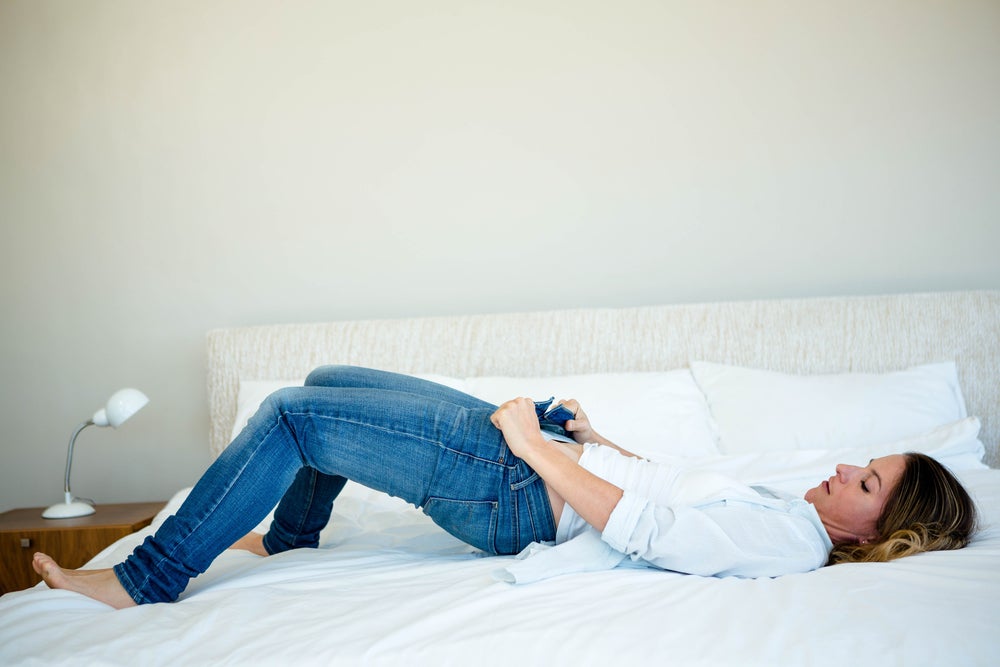 Putting on a freshly laundered pair of jeans.