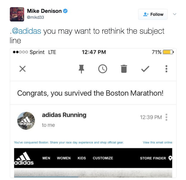 Today Adidas joined the long line of companies that have recently found themselves in a PR misstep (think Pepsi and United) after they sent out a poorly worded e-mail to finishers of the Boston Marathon.