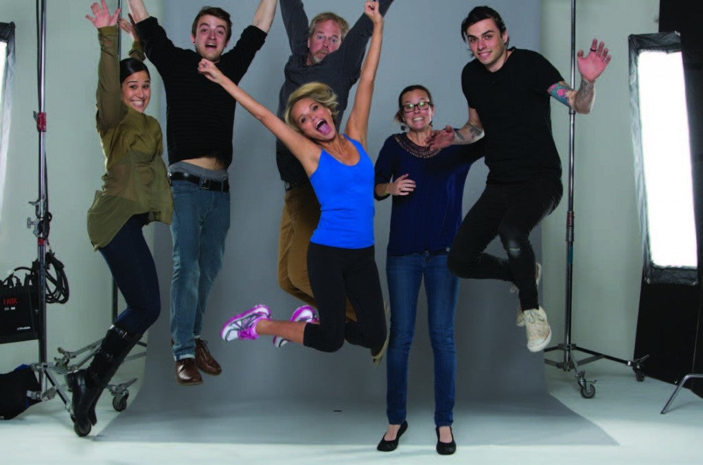 Channeling her high school cheerleading days, Kristin insisted on a group jump shot. From left: WR publicist Jessica Saraniero, videographer Gabe Harden, Kristin Chenoweth, WR photographer Scott Draper, WR associate editor Caitlyn Pilkington and photo assistant Fletcher Anstis.