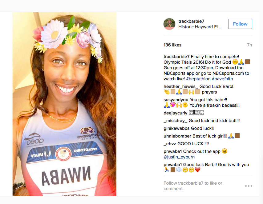 The event will continue tomorrow, but at the end of the afternoon today, Barbara Nwaba of the Santa Barbara Track Club held the lead. Check this out: She ran the hurdles in 13.65 seconds (only 1.3 seconds slower than Brianna Rollins, the woman who won the hurdles outright to punch her ticket to Rio yesterday), cleared a high jump of 1.9 meters (that’s more than 6-feet, 2-inches!), chucked a shot put 14.16 meters and ran a cool 24.17 seconds in the 200 meters (that’s 3:12-mile speed!). We also love that she did it all with a huge smile. Check out her fun Instagram post from this morning—it’s clear this lady loves what she does.