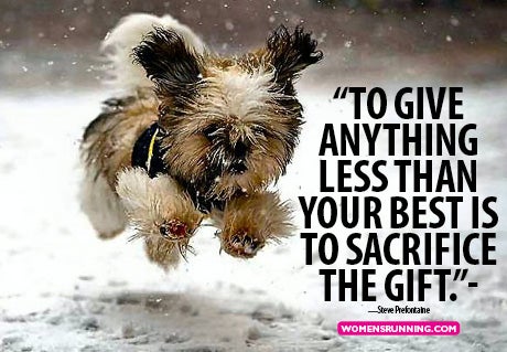 We’re at it again. We hate to admit how shameless we are, but we just can’t help ourselves. We find these cute little bits of inspiration (in the form of fluffy puppies) and creativity takes over. You see, here at Women’s Running we love determination no matter what form it takes. How could we not glean some motivation from this tiny little dog’s dedication to run through the snow? Even better, it reminds us of something Steve Prefontaine once said, “To give anything less than your best is to sacrifice the gift.” So girls, make sure you give your best today. . .because running is a gift.