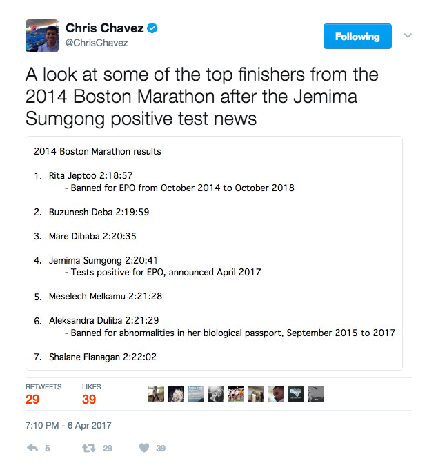 And both Jeptoo and Sumgong ran the 2014 Boston Marathon—the year Shalane Flanagan ran the race of her life, setting a new American record and placing seventh behind both of the Kenyans. As is currently stands with potential and standing bans, it looks like that may soon move up to fourth.