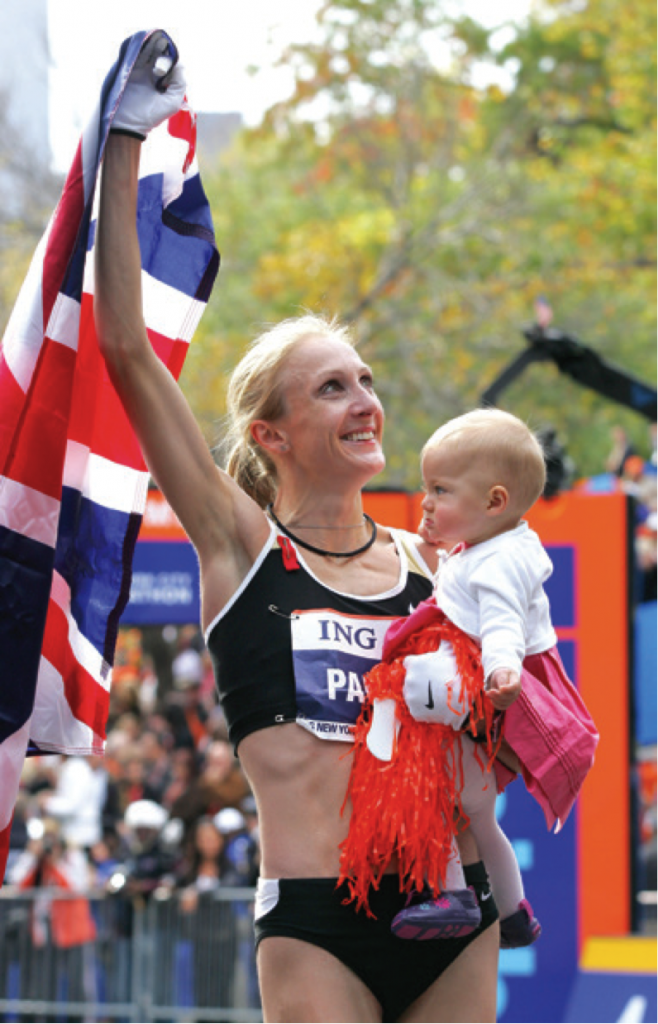 In 2007, British racing phenom Paula Radcliffe proved that being a mom and a world-class athlete could go hand in hand. Less than 10 months after giving birth to her first child, she returned to racing to win the New York City Marathon with a time of 2:23:09. Before the race, Radcliffe was quoted in The New York Times as saying, “If I’m happy, I train better and I race better…and the fact that I’ve got a little angel in my life makes me run better.”