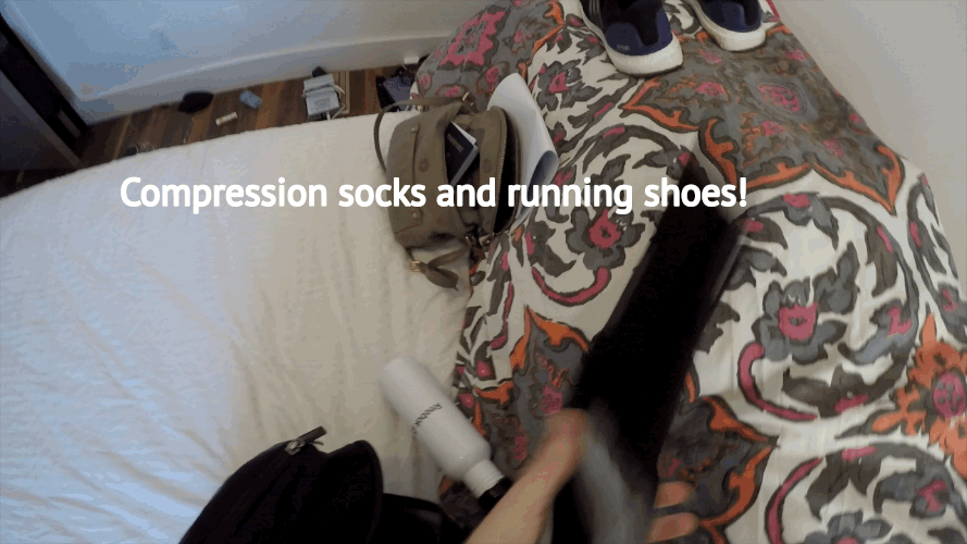 I wear both onto the plane because my race day shoes are comfortable and compression socks keep my legs feeling fresh.