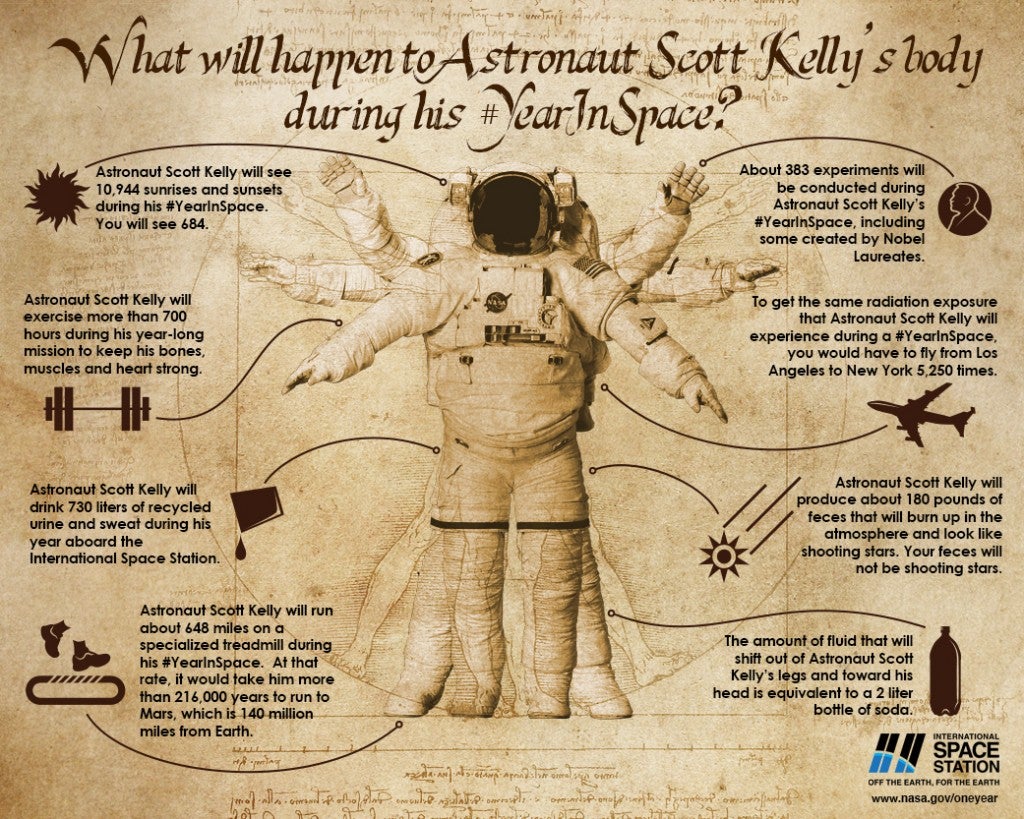 Last Tuesday marked the halfway point of Astronaut Scott Kelly’s year in space on board the International Space Station. If you think he’s hanging out playing Words with Friends and eating Astronaut Ice Cream (love that stuff), think again! Part of Kelly’s daily routine, besides conducting experiments, is hitting the treadmill, albeit one especially designed to work in space. According to NASA, he’s expected to run about 648 miles.