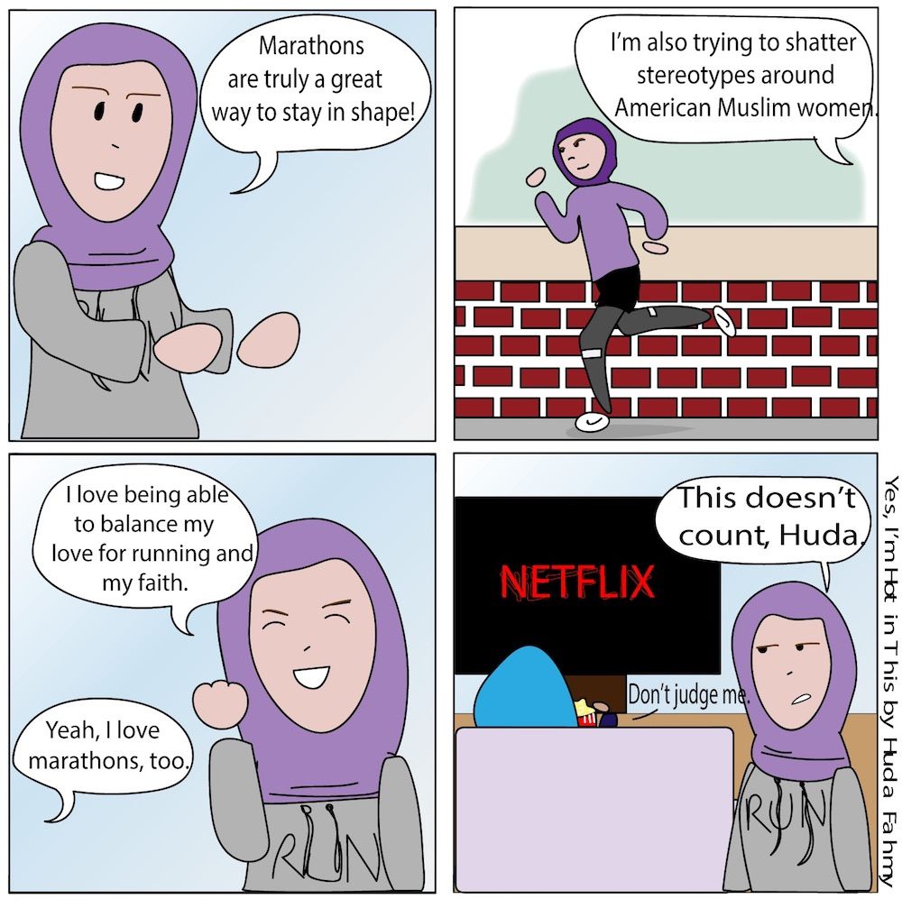 Huda Fahmy crafted this comic as a tribute to her friend Rahaf Khatib, who readers may remember from Women’s Running magazine’s October 2016 cover. “I am so proud of Rahaf Khatib for the amazing work she’s done to raise awareness for refugees and simultaneously break stereotypes surrounding Muslims. She inspires me to push past my comfort zone,” Fahmy says. The illustrator, an innovator in her own right, is the creator of the hilarious Instagram Yes I’m Hot in This, where she primarily shares her experience as a Muslim-American. While Fahmy prefers to run a few miles on her home treadmill, her favorite marathons are accompanied by an “Are you still watching?” prompt. Fahmy explains she wanted this particular cartoon to say, “Hey! Look! We run and we binge TV. We’re different, but that’s okay.” For more funny and creative designs follow Fahmy on Instagram at @yesimhotinthis, and follow @runlikeahijabi too.
