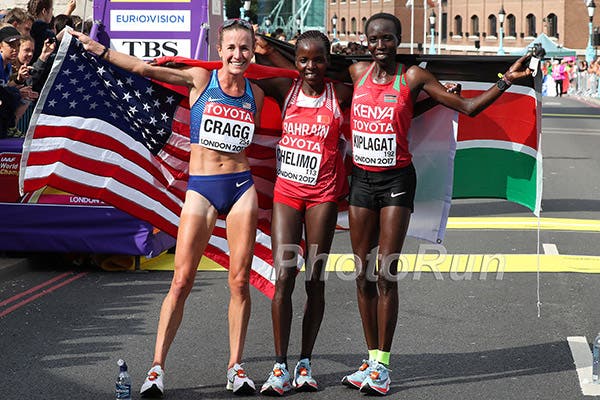 Eighteen months after winning the Olympic Trials Marathon, Amy Cragg had America cheering again when she finished third in the world marathon. She was the first American woman to medal in the event since the championships began in 1983. Cragg finished in 2:27:18 in a crazy sprint finish in the last 400 meters after leading a good chunk of the race. The first four didn’t make a break from a deep pack of more than 10 until the final 5K, and Cragg made her final game-changing move in that last quarter mile, passing the fourth place finisher to win bronze…and she almost got silver at the line too. Athletes on social media erupted in cheers for Cragg, including Sara Vaughn and her two-year-old daughter on Instagram.