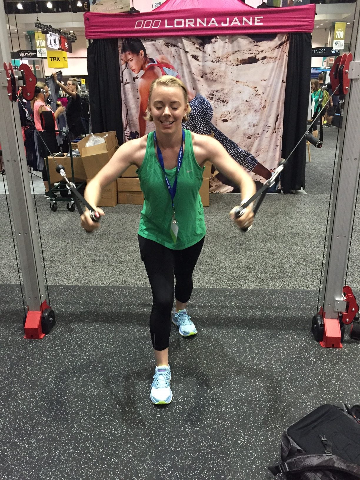 TRX has a new twist on its suspension-training system that as revealed at the expo. You may find yourself twisting as you attempt a pushup with holders that aren’t connected. As trainers had their own class on how to teach others, we noted some serious shaking going on. But as with other TRX moves, there are ways that people of all different fitness levels can use the equipment.
