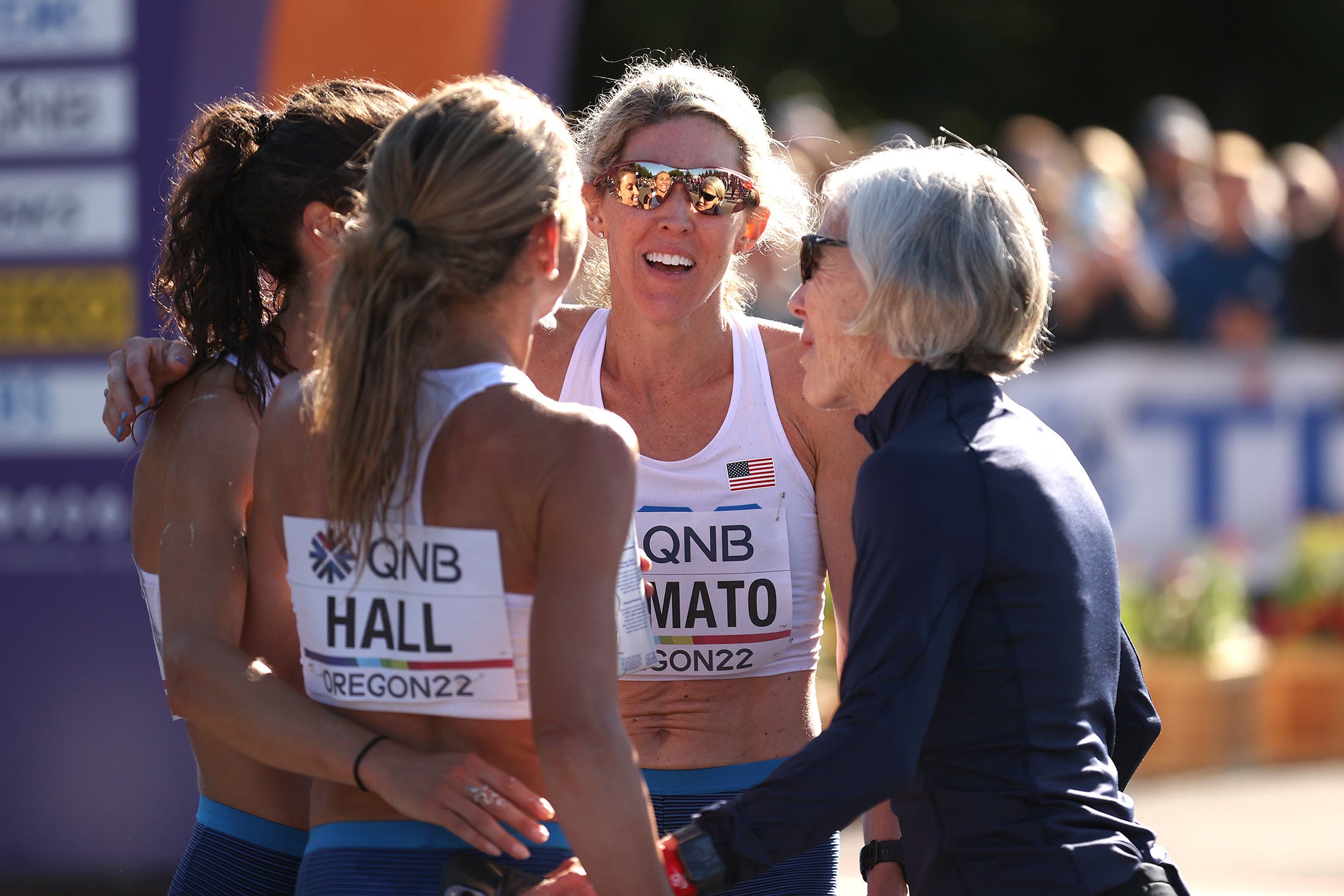 Emma Bates, Sarah Hall and Keira D'Amato of Team United States react after competing in the Women's Marathon on day four of the World Athletics Championships Oregon22 at Hayward Field on July 18, 2022 in Eugene, Oregon. (Photo: Hannah Peters/Getty Images for World Athletics)