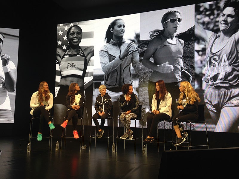 Nike’s sponsored athletes firmly believe in what the brand can do for their sport. In a women’s athlete panel hosted by American sprinter and Olympic gold-medalist Allyson Felix on day two of the summit, pro surfer Carissa Moore, WNBA player Skylar Diggins, marathoner Joan Benoit Samuelson, Chinese professional tennis player Li Na and Paralympic triathlete Sarah Reinertsen shared what has contributed to their individual successes and their thoughts on the growth of women participating in each of their sports. After the panel, though, I was able to get an exclusive interview with Joan Benoit Samuelson, Allyson Felix and Sarah Reinertsen who reveal why as runners they’ve stuck with the powerhouse brand and what their training looks like these days (because we could always use some great tips from the pros).