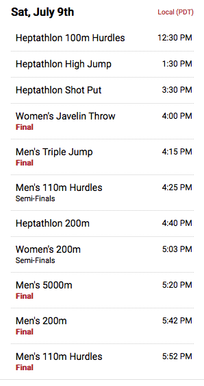 On tap today were a whole bunch more qualifying and semi-qualifying rounds. Get a refresher of what that means in our recap of day 7. Women’s pole vault and 200 meters as well as men’s 110-meter hurdles had their first round. Women’s and men’s 400-meter hurdles and 1,500 meters and men’s 200 meters ran semi-finals. Finals (the races that decide who will go to Rio) were held for men’s discus, men’s 3,000-meter steeplechase and women’s 100-meter hurdles.