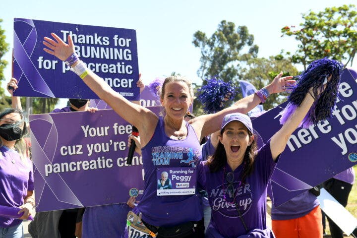 She will be celebrated along the marathon course by pancreatic cancer survivors and supporters, especially at the Hirshberg Foundation’s Purple People Party Cheer Station near Mile 21.