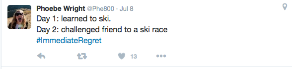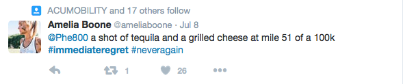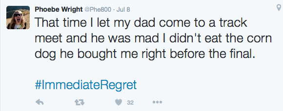 Wright may not have made the Olympic team, but in the days following she has been striking pure gold on Twitter. She challenged her followers to share their biggest #immediateregret. There were some hilarious gems from other runners—like pro obstacle course racer Rose Wetzel and Spartan race star Amelia Boone.
