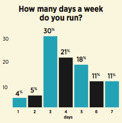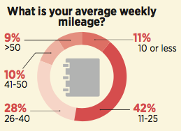 The majority of our runners log between 11 and 25 miles each week, but nine percent reported running 50 miles or more during an average week.