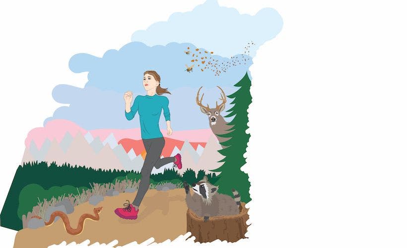 You may not consider these tiny insects “wildlife,” but any time you’re running through a wooded area, they’re a real threat to your health. Ticks can transmit some serious diseases, such as Lyme disease and Rocky Mountain spotted fever. Ticks live in the more moist regions of the country, so the Northwest, north central, Northeast, Southeast and Mid-Atlantic areas. “Stay to the center of the trail,” Fredericks says. “Questing ticks, or the ticks that are looking for a host, are going to be hanging on vegetation along the edges.” He also recommends wearing repellent and, when you take your post-run shower, doing a full-body tick check. Remove them with a pair of tweezers by grabbing them gently but firmly right behind the head and pulling steadily until they let go.