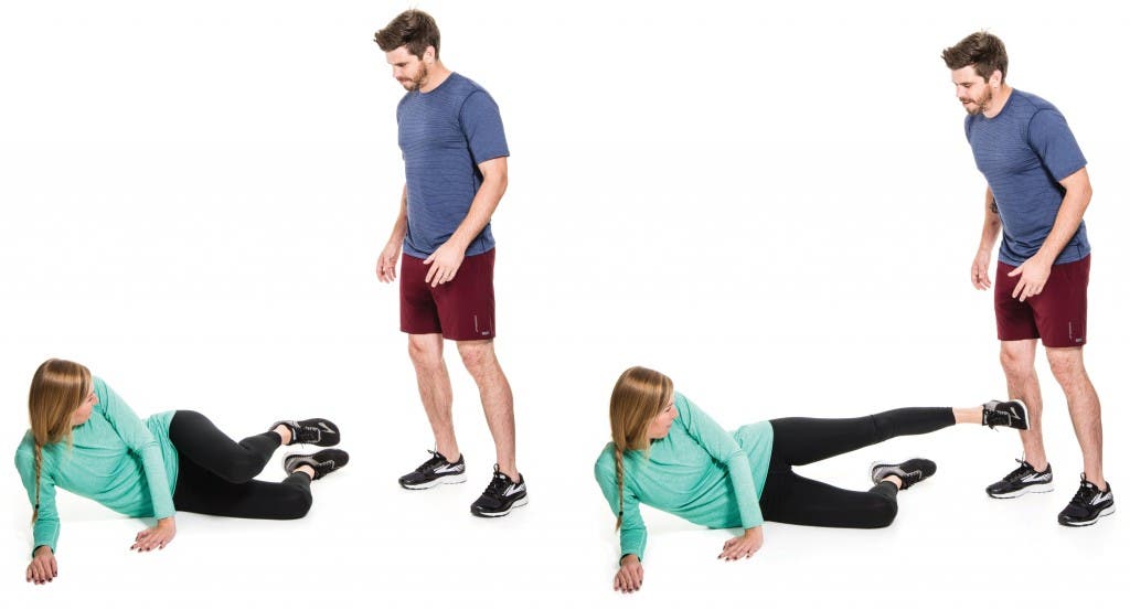 Lie on your side. Support yourself with your elbow, with your forearm and palm down. Use your top leg to kick out toward attacker, aiming for either the thigh or shin.