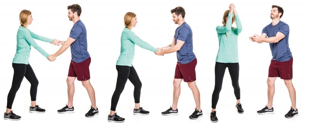 Stand with feet in staggered stance. Swing arm backward as if you’re swimming, then diagonally across the body like a tennis serve.