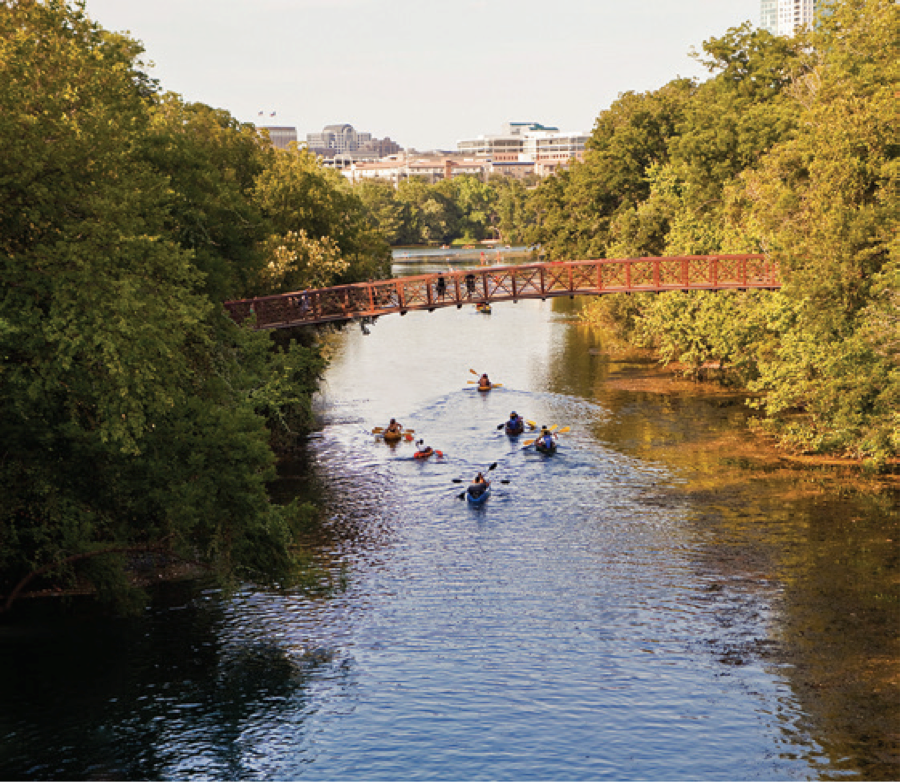 The new Boardwalk Trail on Lady Bird Lake—part of the Colorado River running alongside downtown—connects existing trails for 10 miles of waterside mileage with towering urban views. Be sure to note the “Belting It Out” installation of 36 bronze belts with music lyrics that will leave you humming. Luke’s Locker running store is just off the Ann and Roy Butler Hike-and- Bike Trail if you’re looking for gear and group runs.