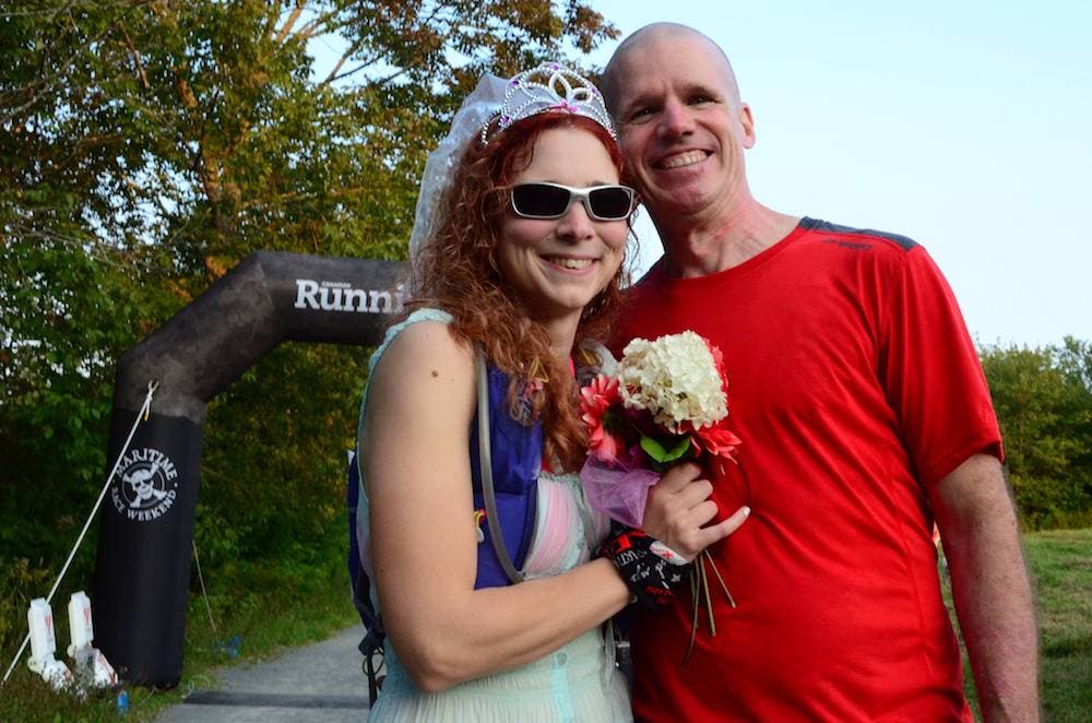After finishing the Maritime Race Weekend Tidal 15K in Nova Scotia in September, the beaming couple–still in their running attire–tied the knot in front of friends and other finishers.