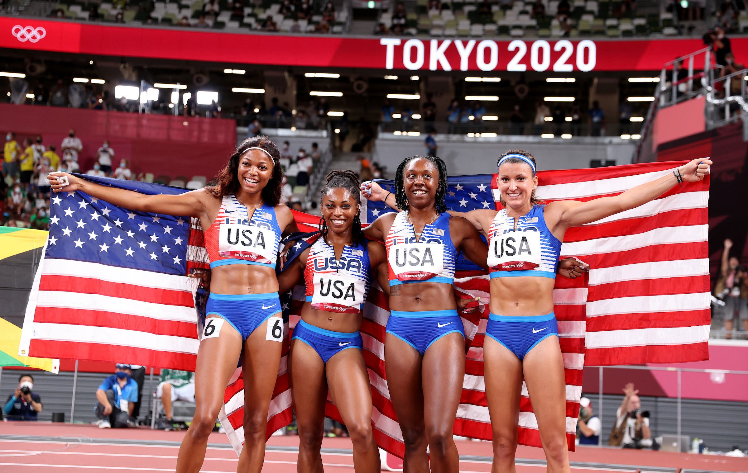 Jamaica clinched gold in 41.02, a national record; they were behind the U.S. (world and Olympic record holders with 40.82) the last two Olympics but started off and stayed strong during the relay. A dominant sprinting team of Briana Williams, Elaine Thompson-Herah (her third gold these Games, after the 100 and 200 meters), Shelly-Ann Fraser-Pryce, and Shericka Jackson delivered for Jamaica.