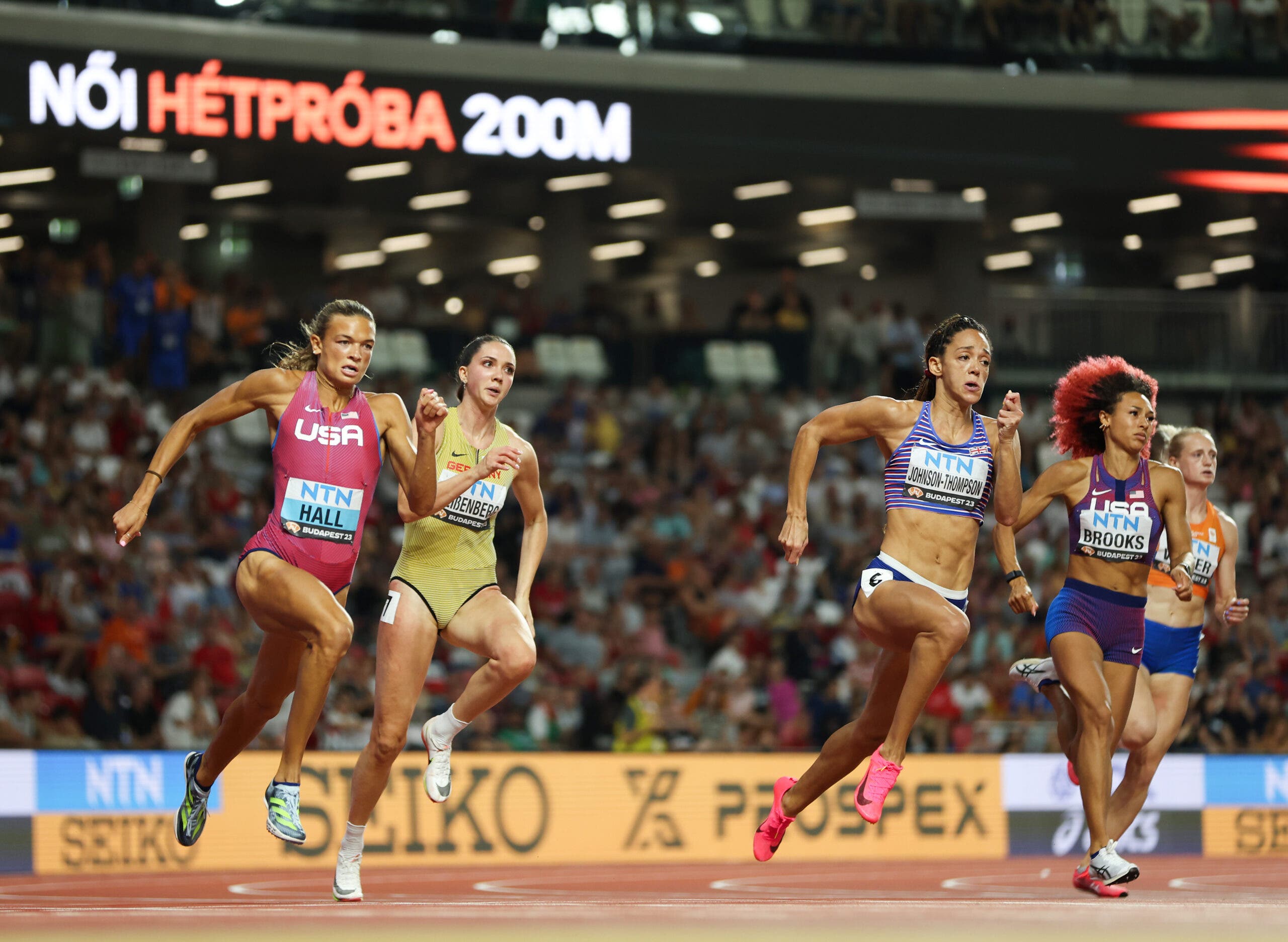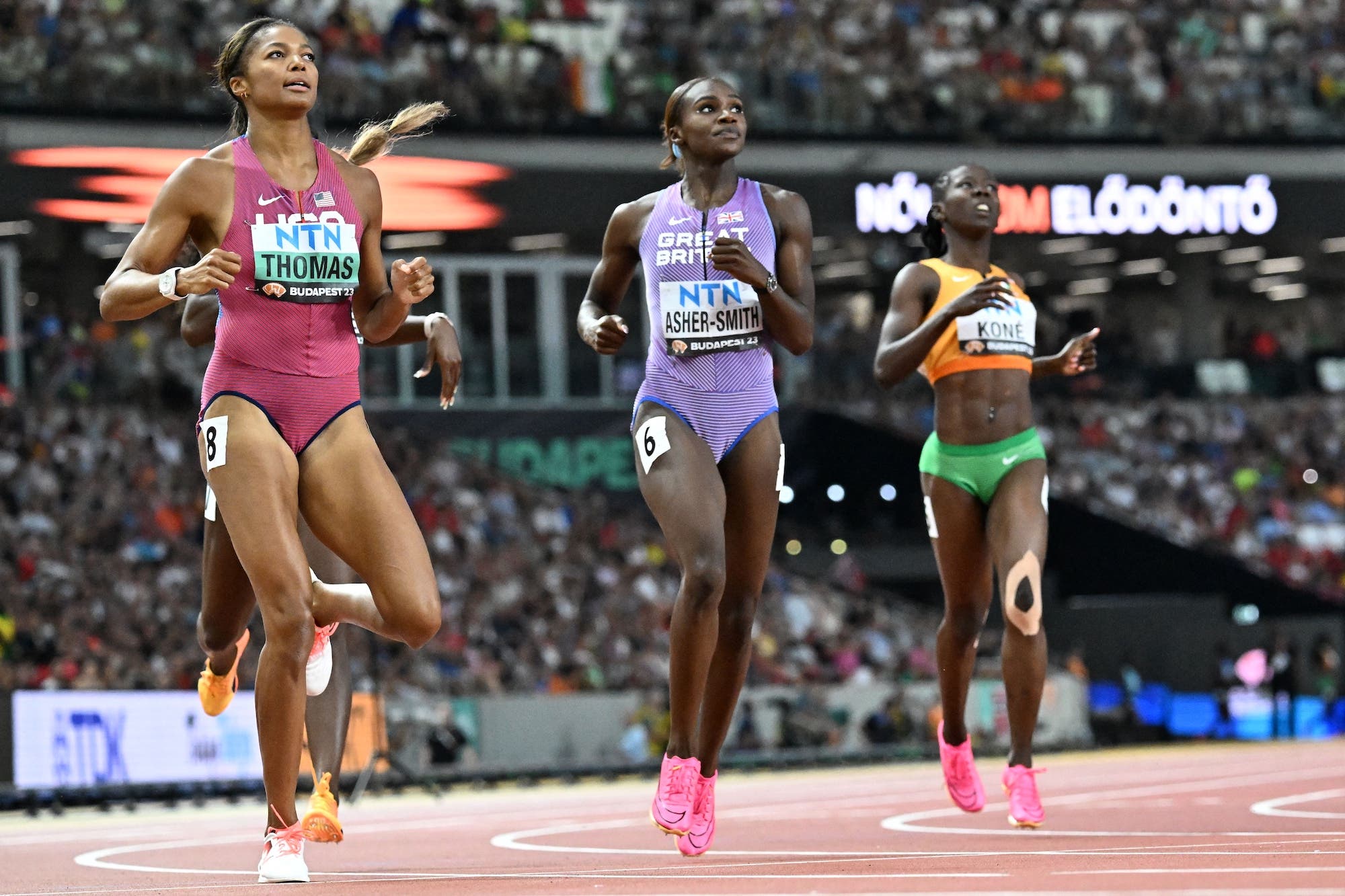 Gabby Thomas, 26, took the first heat in the 200-meter semi-final, with a decisive time of 21.96. Thomas is an Olympic silver and bronze medalist. After coming strong off the blocks, Thomas lost a little traction on the turn to Britain’s Dina Asher-Smith, but regained the lead with a strong kick in the last 50 meters to take her performance into the final.