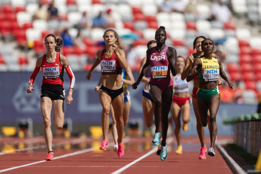 Just a few weeks ago, it was unclear if the U.S.’s Athing Mu would compete in Budapest, but compete she did – in custom blue, bedazzled spikes. Mu won her heat in 1:59:59. Mu went out hot, and faded slightly but was able to hold off Jamaica’s Natoya Goule-Toppin and the chase pack.