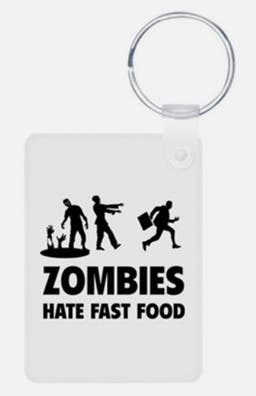 You know the joke friends make on camping trips when you worry aloud about bears: “I don’t have to run faster than the bear; I just need to run faster than you!” The same goes for zombies, as this keychain reminds us–they just can’t keep up with fast food.