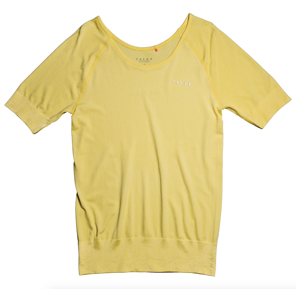 The fix: Slip on a seamless T-shirt with a nice loose fit around the torso and a fitted waistband at the hips. The wider scoop neck on this breathable blend number allows more comfort, so the neckline never chafes. Slightly longer raglan sleeves with plenty of stretch lower sunburn risk and cover the tops of your arms. Reflective details help with visibility at night or early in the a.m. It’s pricey, but we’re impressed with the quality.