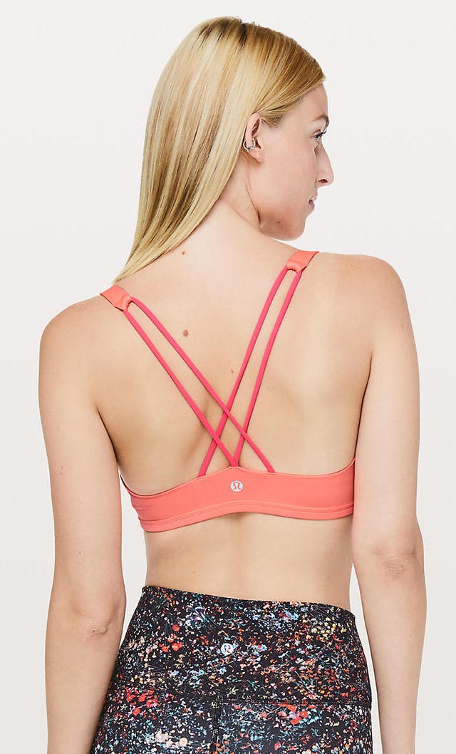 Perfect for smaller-busted women (or for low-impact activities such as yoga), this coral-colored bra caught our eye, especially because of the grapefruit-colored criss-crossed straps on the back. The Lycra fabric gives it a smooth feel and moisture-wicking capabilities, and it has pockets for optional, removable cups.