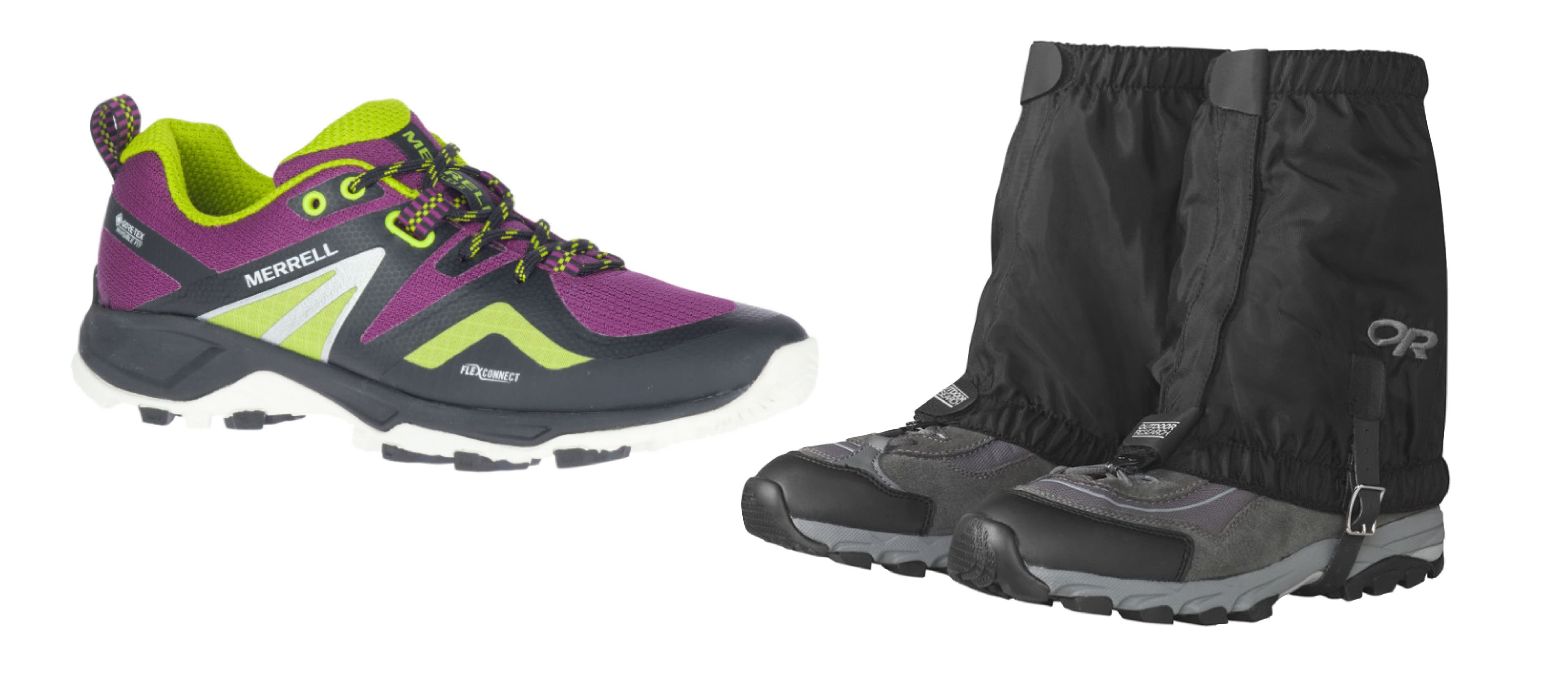Waterproof but breathable, good running shoes help make snowy or rainy conditions bearable for your feet. Try a trail-running shoe like the Merrell MQM Flex 2, made just for bad winter weather. Wearing gaiters over your calves will keep your ankles and legs dry when the snow is deep. When the ground is icy, slip on a set of crampons on your running shoes to give you more traction and prevent slipping on hard snow or ice.