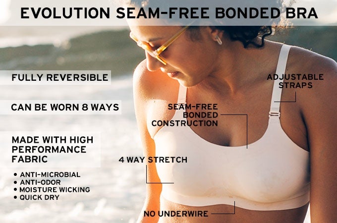Bonded construction, with no underwires and four-way stretch for body contouring comfort, delivers no-show support for sporting under nine-to-five attire. Mad with breathable, moisture-wicking fabric with silver fibers to kill odors, this bra is perfect for on the run, around the house or even at the office. What’s more? (There’s more?!) Removable straps can be worn over the shoulder or crossback for higher-intensity support, and each bra comes with two sets of straps in different colors to work with your mood and your outfit.