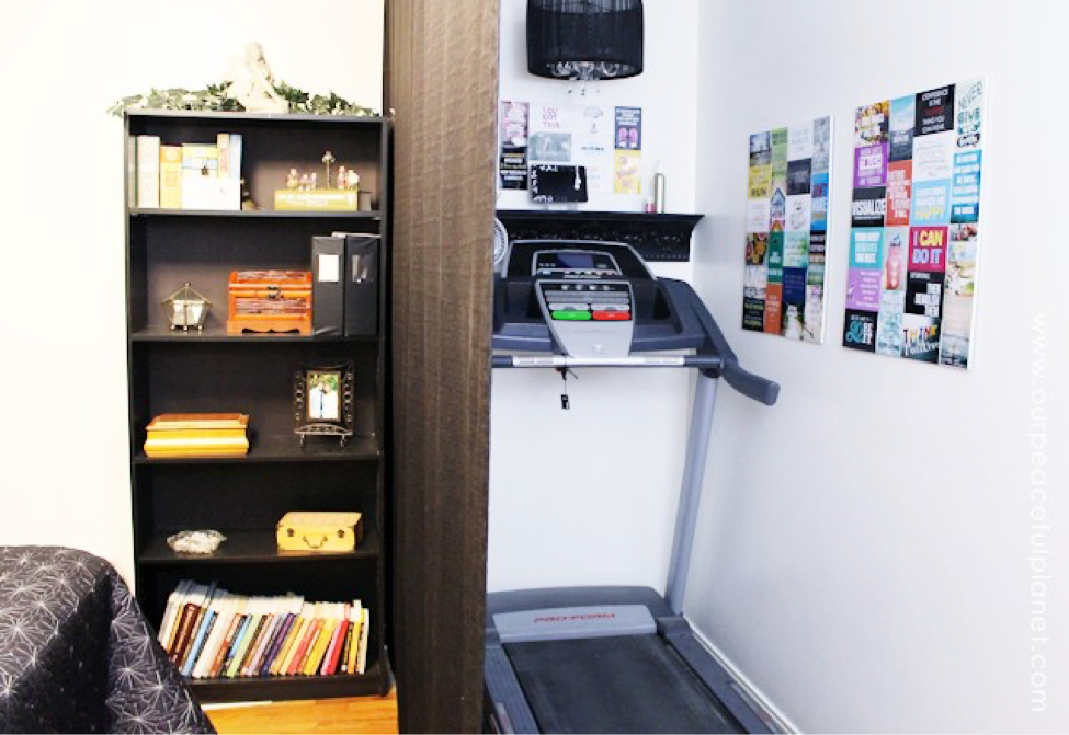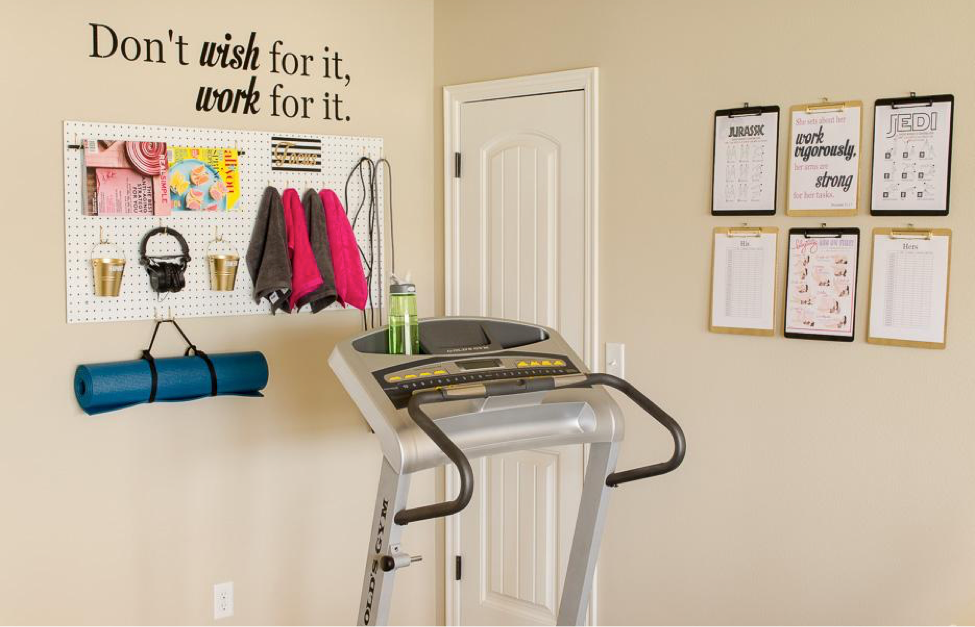 The best way to solve a storage dilemma in a crowded space is to go vertical. A pegboard panel or open shelving unit gets your supplies off the ground and lets you get to them fast when you’re feeling the urge to sweat. However, if your issue is that you have too much equipment stuffed into the area, try swapping out the heavy treadmill for a foldable exercise bike or portable elliptical that can be stashed in a closet when the workout is over.