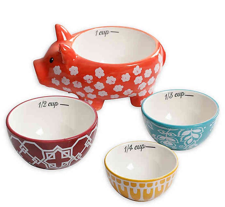 A kitchen gift that takes decor and makes it practical: 1-cup, 1/2 cup, 1/3 cup, and 1/4 cup measuring cups all cutely nestled into a little piglet. $19.99, amazon.com