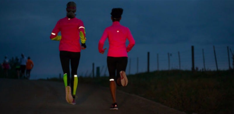 When it comes to safe running at night you need to see (take a headlamp) and be seen. Pearl Izumi’s latest BioViz apparel line capitalizes on fluorescent colors, 300 candle power reflectivity and contrast and patterns to keep runners visible in dark conditions. The idea is that a variety of bold, high visibility methods means you’ll be seen sooner, giving drivers more reaction time.