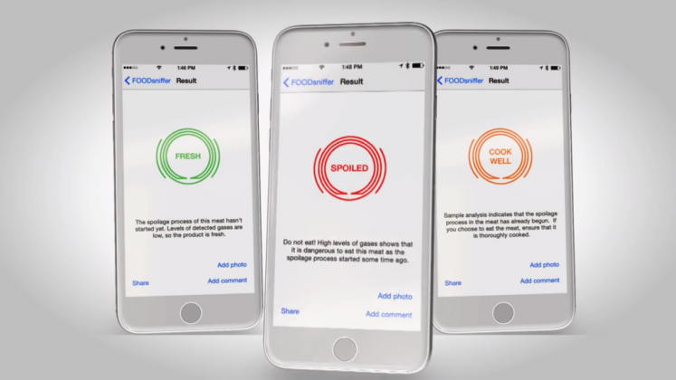 The FOODsniffer is a handheld device that checks beef, poultry, pork or fish—or, to be exact, the air around it—to determine if it is fresh, if you should cook it well, or if it is spoiled. The device partners with an app (available for both iPhone and Android). When starting it up, you select the type of meat you are checking and let the FOODsniffer check the organic compounds emitted before displaying the results directly on the app in your phone.
