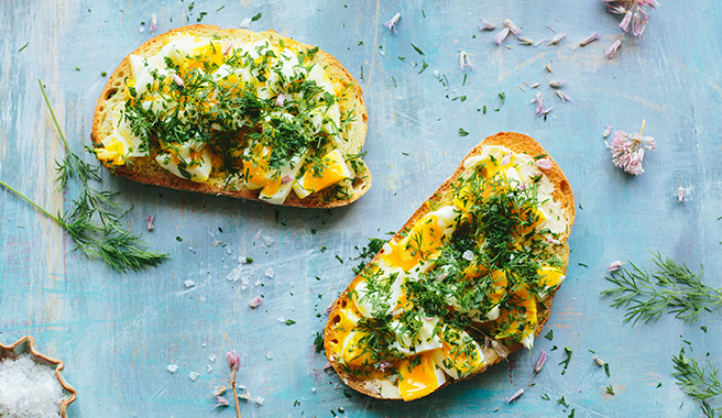 Eggs are a great source of post-workout protein, and they cook up in minutes. For this recipe, add a generous sprinkling of herbs on top and a piece of toast beneath, and you’ll have a protein-packed breakfast that’ll keep your energy levels up for hours.