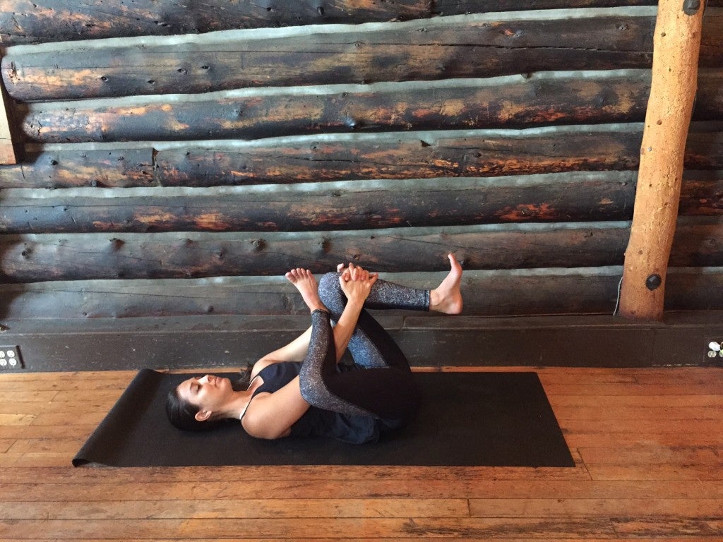 Lie on your back. Bend one knee so that the foot rests on top of the straight leg with the knee out to the side of the room. Bend the straight leg toward your chest and grab the shin. Pull the shin toward your chest until you feel a stretch.
