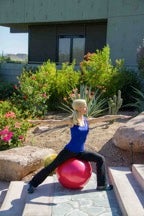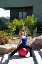 Sit on the ball in Yoga Warrior II pose, to the left side. Right leg is extended and the foot is at a slight angle. Left knee is bent and arms are extended to the sides. Inhale and stretch the left arm to the sky. Looking up, exhale. Hold stretch for three more breaths. Repeat on the other side.