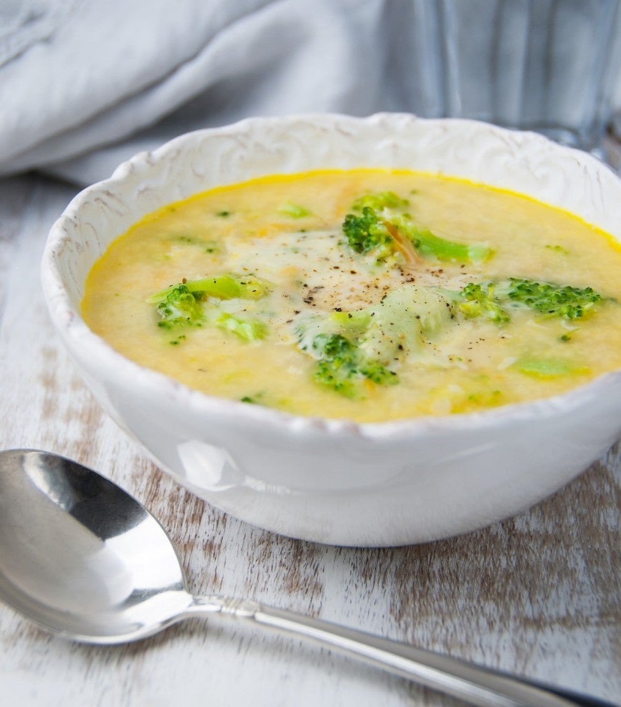 Melt the butter in a large soup pot or Dutch oven over medium heat, then add the carrot and shallot, season with salt and pepper and sauté until the carrots are tender, about 3 to 5 minutes. Pour in the chicken broth and heat. Add the milk and cream, season with salt and pepper and increase heat to medium-high to bring the soup to a simmer. Turn the heat to medium, then simmer for 10 minutes, stirring occasionally. Add the broccoli florets to the pot and cover to simmer for 20 more minutes or until the broccoli is tender. Remove the pot from the heat, then add cheese in three batches, stirring until it’s completely smooth before adding the next batch. For a thinner soup, mash broccoli with a potato masher or leave in whole pieces. Serve with fresh raw cheddar on top and fresh cracked pepper.
