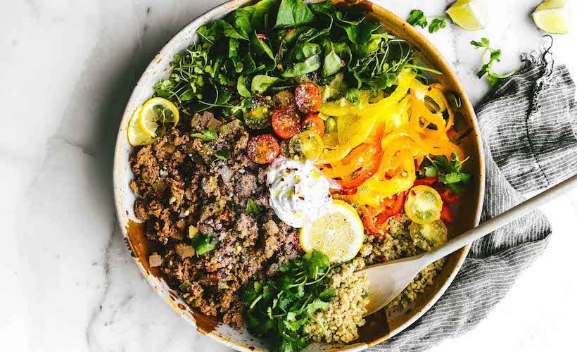 For the bowl, spoon the quinoa into a large bowl, followed by the spinach. Add in the ground meat mixture, and top with the sliced bell pepper, cilantro, green onion and cherry tomatoes.