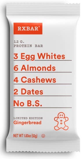 A single serving of RXBar’s gingerbread flavor offers 12 grams of protein, 4 grams of fiber and 210 calories. Made with a handful of clean ingredients (egg whites, dates, almonds, cashews and natural spices), this snack works well as an on-the-go snack or a post-workout treat.