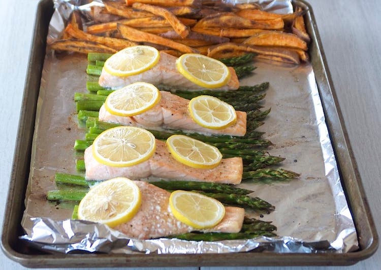 The dietary guidelines recommend eating at least eight ounces or two servings of fish per week. Yet a recent survey found that most Americans only eat about one-third of those recommendations. Make fish part of your regular diet with this sheet pan of salmon and vegetables.
