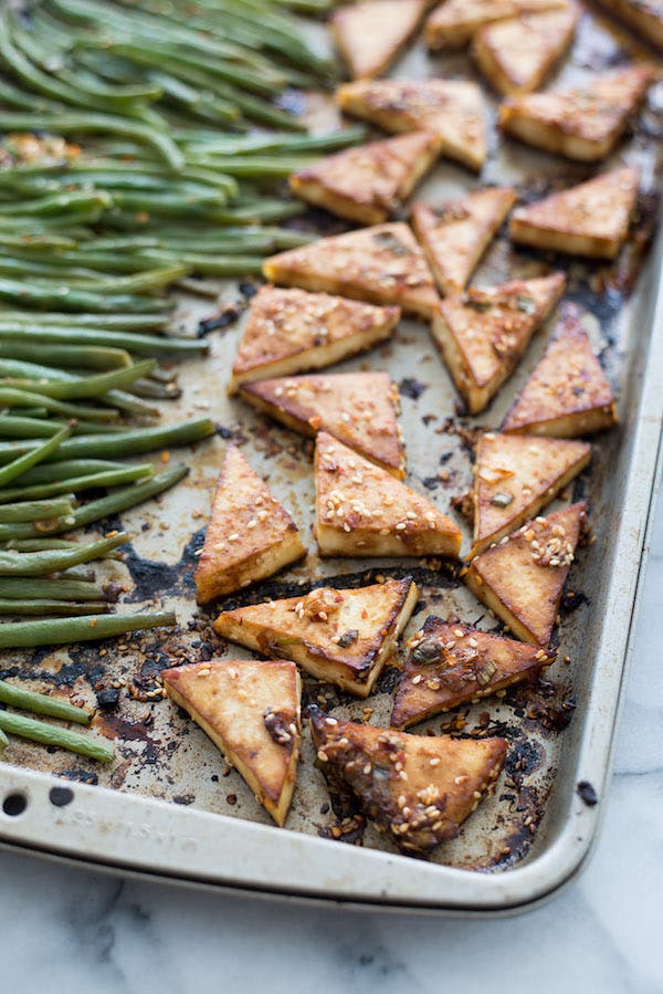 There aren’t very many sheet pan dinners for vegetarians, but this recipe breaks the mold. By marinating and baking the tofu, it comes out a bit more crunchy than soft. Plus, tofu is a great source of affordable protein for a family of four.