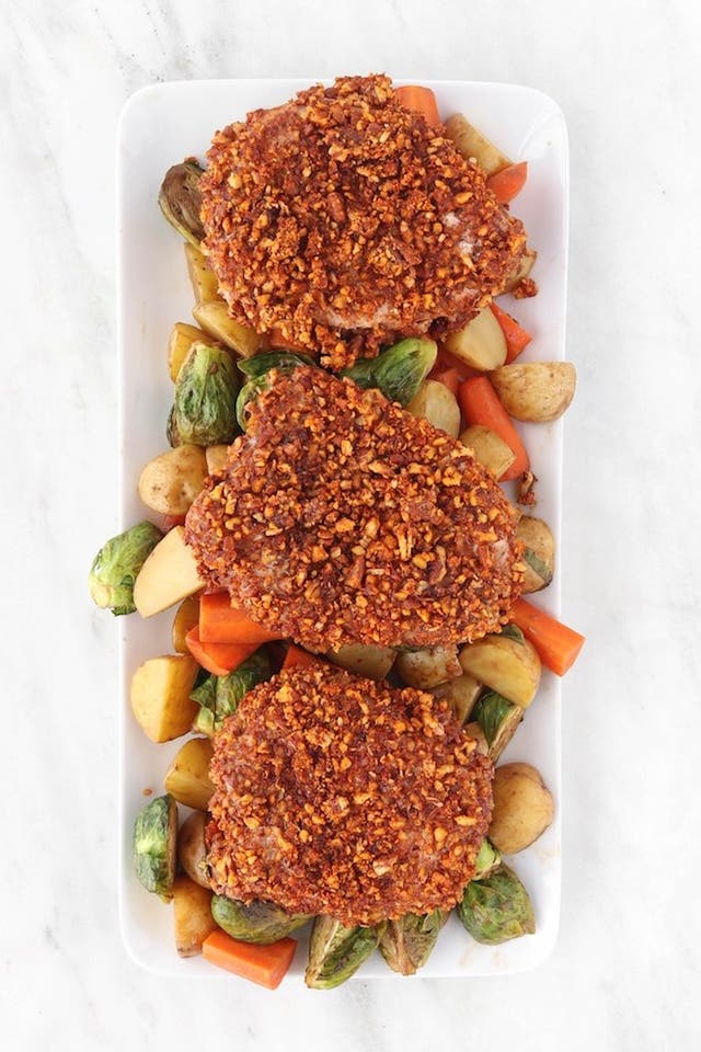Doesn’t the name of this dinner just sound divine? The crunchy pecan crust and the sweetness of the honey balsamic roasted veggies go together so well that you won’t believe this is all made on one pan.