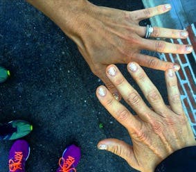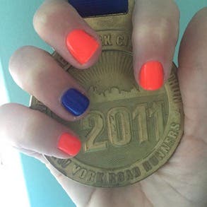“In 2015, I painted my nails orange and blue, the New York City Marathon colors. I’m not going to lie, I’m a pretty girly girl (hi, I run in a skirt), so I loved looking down at my hands during the race to see this bit of happiness when things got tough.” —Theodora Blanchfield of Preppy Runner