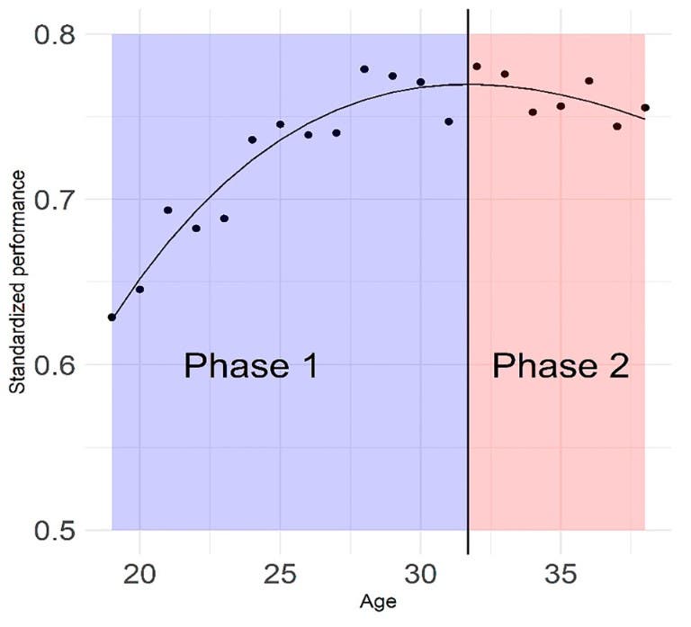 To account for the effects of age, Forstmann and his colleagues use mathematical modeling to plot the typical career trajectory for female marathoners. For the 37 women in the study, that relationship looks like the graph below, with a gradual increase in performance up to a peak age of 31.7, followed by a gradual decrease in performance: