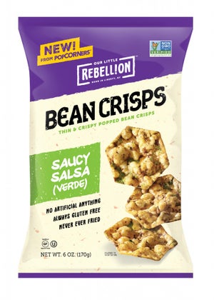 These are thin and crispy gluten-free and non-GMO popped bean crisps, made with black beans and green and yellow split peas, plus loaded with 4 grams of protein and 3 grams of fiber per serving.