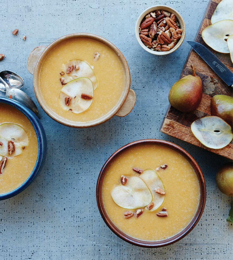 Preheat oven to 350 degrees. Cut squash in half lengthwise and scoop out seeds. Brush inside with coconut oil and place, flesh down, on a baking sheet. Bake until tender, 35–40 minutes. Meanwhile, heat the coconut oil in a soup pot and sauté onion, celery and pear with a bit of salt until softened and lightly caramelized. Add stock to the pot and simmer for 30 minutes, uncovered. Scoop the roasted squash out of the peel and add to the simmering stock. Stir in the coconut milk, maple syrup, ginger, cinnamon, nutmeg and vanilla, and simmer for another 30 minutes. Purée with a high-powered hand blender or in batches in a blender until smooth. Start blending slowly first before running at a higher speed to avoid splashing hot soup. Serve in bowls garnished with pecans.