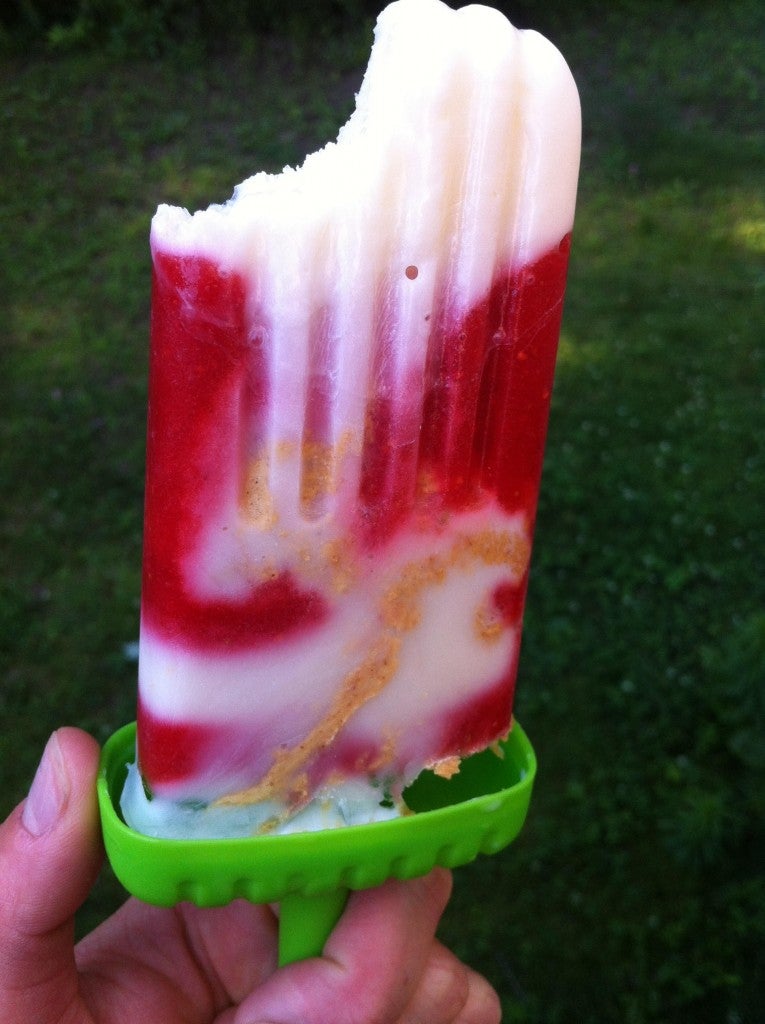 Blend together tart cherry juice and berries until they form a liquid mixture. Set aside. Mix nut butter and honey together in a separate bowl. Use a popsicle mold that yields 6 popsicles. Alternate pouring in berry mixture, nut butter and honey mixture, and add scoops of greek yogurt. Keep layering until you reach the top of the popsicle molds. Freeze overnight and enjoy after your next run!